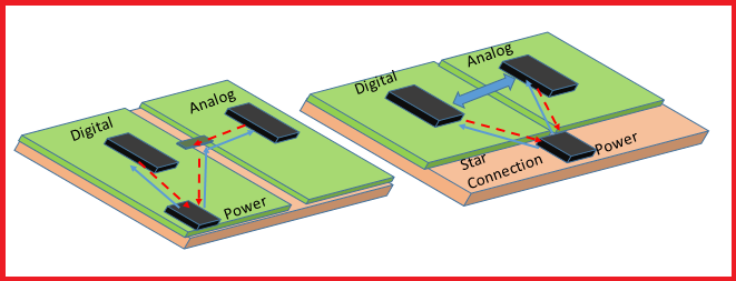 In mixed-signal boards, it is imperative to plan the component placement so that analog and digital signals do not cross each other. Refer to the above image (left) for the return path of an analog signal. In this case, we see that the board area is split into the digital and analog sections, and both sections are interconnected in the bottom ground plane stitching at the center. The two planes will still experience capacitive coupling, allowing analog and digital signals to mix. The best approach is to have a single plane, as shown in the image (right), and place the digital and analog components separately. The motive is to prevent the digital signals from traveling beneath the analog region and causing interference.