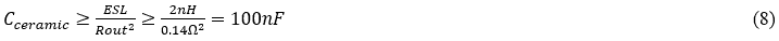 Again, optimum performance is achieved if this ceramic capacitor has an ESR of 0.14Ω consistent with (4) and (7). This may require an external series resistor or an ESR controlled ceramic capacitor.