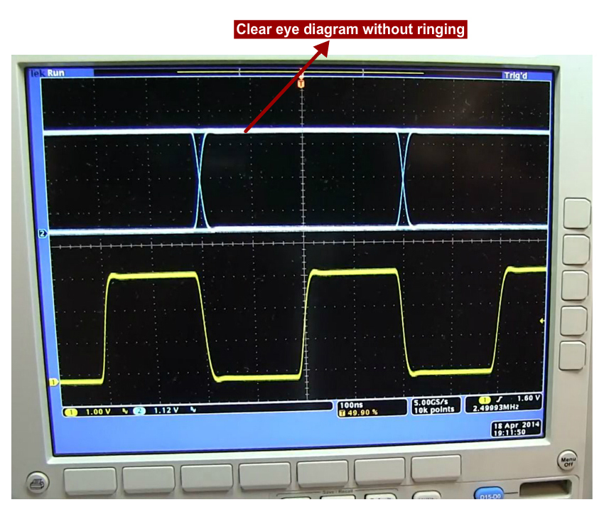 Ringing spikes can be seen on an eye diagram. These fluctuations can result in narrowing eye-openings horizontally. As a result, the signal exceeds its desired voltage and current levels and makes it difficult to distinguish the valid signal levels. The simulation screenshots below show the eye diagrams without and with signal ripples.
