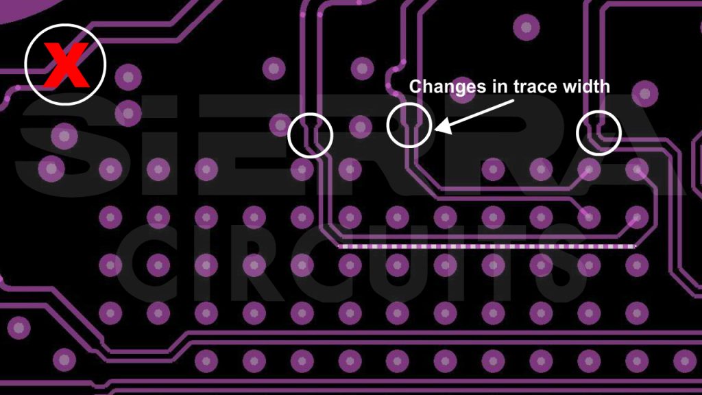 - Maintain consistent trace widths to ensure controlled impedance.