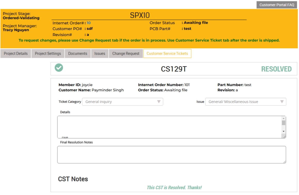 A customer service ticket (CST) is a request submitted by a user/customer through Sierra Circuits’ portal to report post-shipment issues, such as assembly defects, board functional failures, or documentation errors.