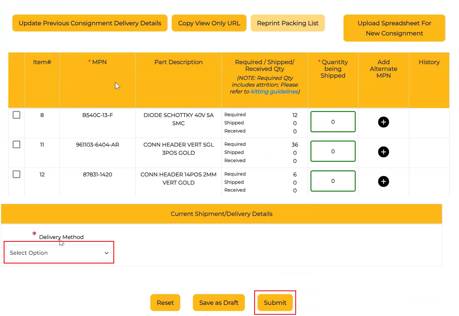 Step 3: Your consigned components will be listed as shown below. Select the parts (checkbox) that you’d like to ship, fill in the Quantity being Shipped, select the Delivery Method, and hit Submit.