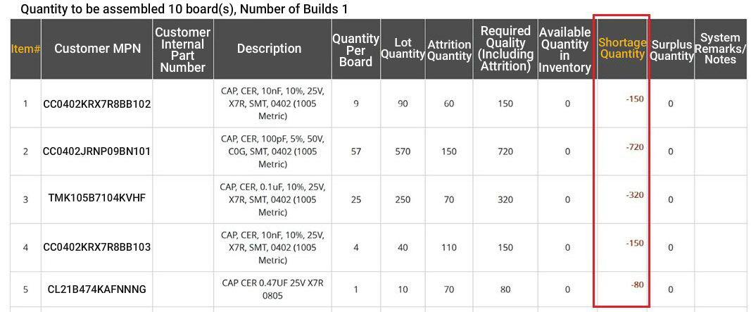For example, if Sierra Circuits requires 100 units of a specific MPN for assembly, plus an additional 50 units to overcome attrition, the total required quantity is 150 units. If we receive only 120 units, we have enough to begin the assembly process, but there is a shortage of 30 units to fully meet the attrition requirement.