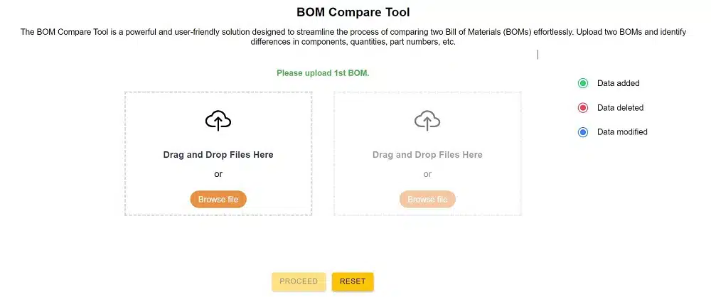 Upload your first BOM on the left as shown above and the second one on the right. The color codes on the extreme right differentiate among newly added, deleted, and modified data. Newly added in green, deleted in red, and modified in blue.